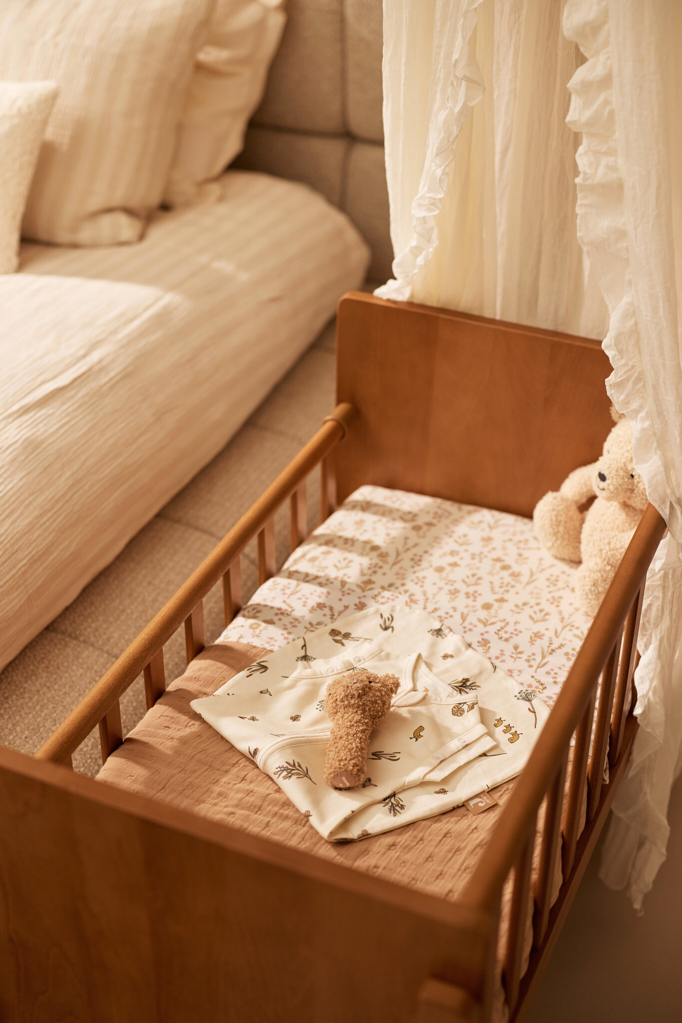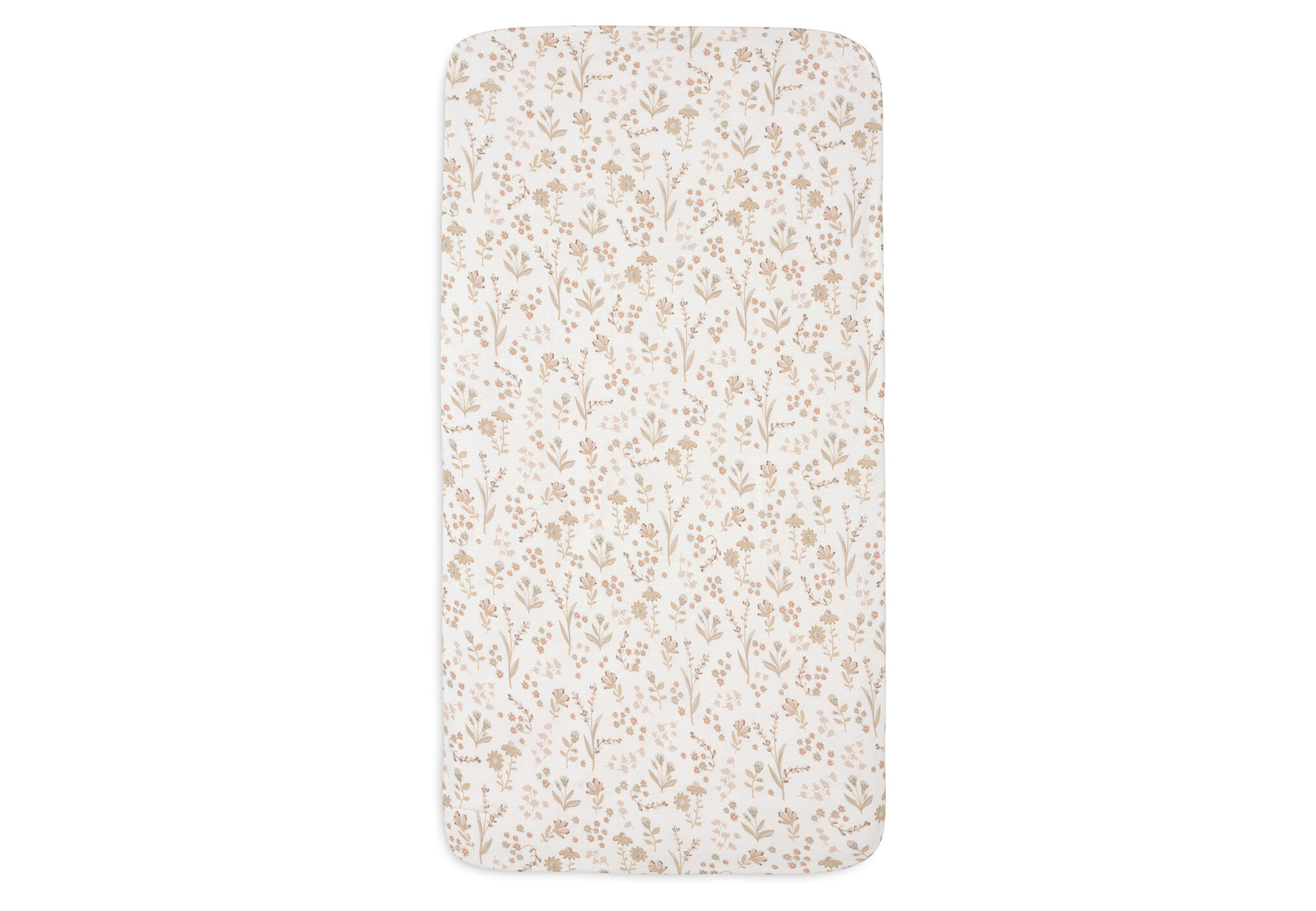 Bescherm het matrasje van jouw mini of dreumes gemakkelijk met dit leuke hoeslakentje. Deze lieve print genaamd Bloomy versiert het hoeslakentje met beige kleurige bloemen. Het hoeslaken sluit gemakkelijk om het matras door de elastieken banden in elke hoek. Het hoeslaken kun je perfect combineren met de dekentjes van het Check Knit thema. Verkrijgbaar voor in diverse formaten voor wieg en ledikant. Tip: een hoeslaken van wiegformaat past ook perfect om een aankleedkussen of in de reiswieg.